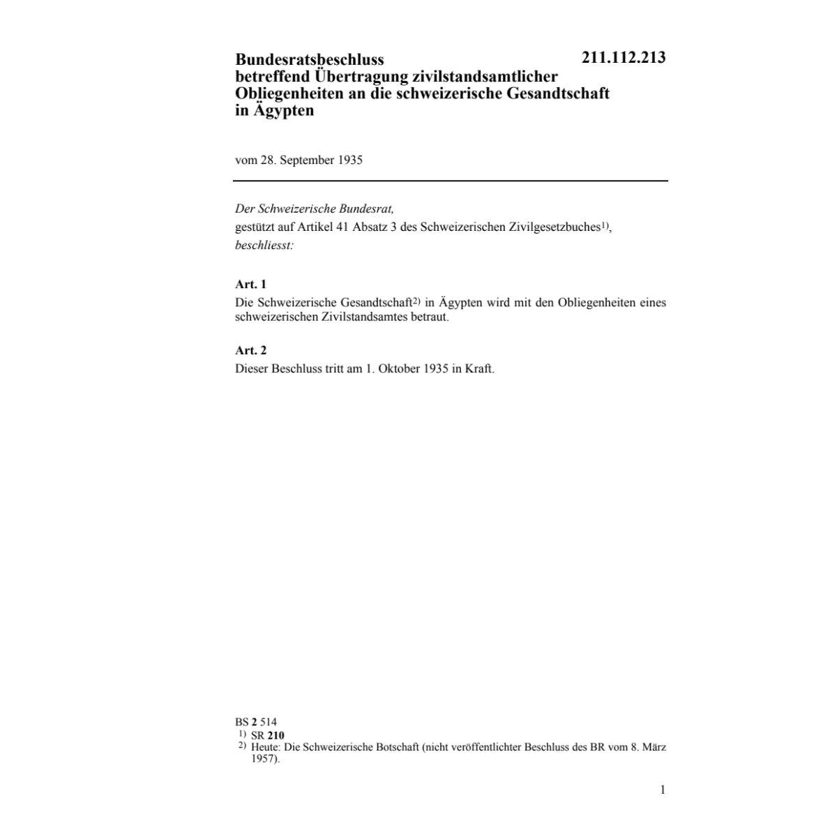 zivilstandsamtlicher Obliegenheiten an die schweizerische Gesandtschaft