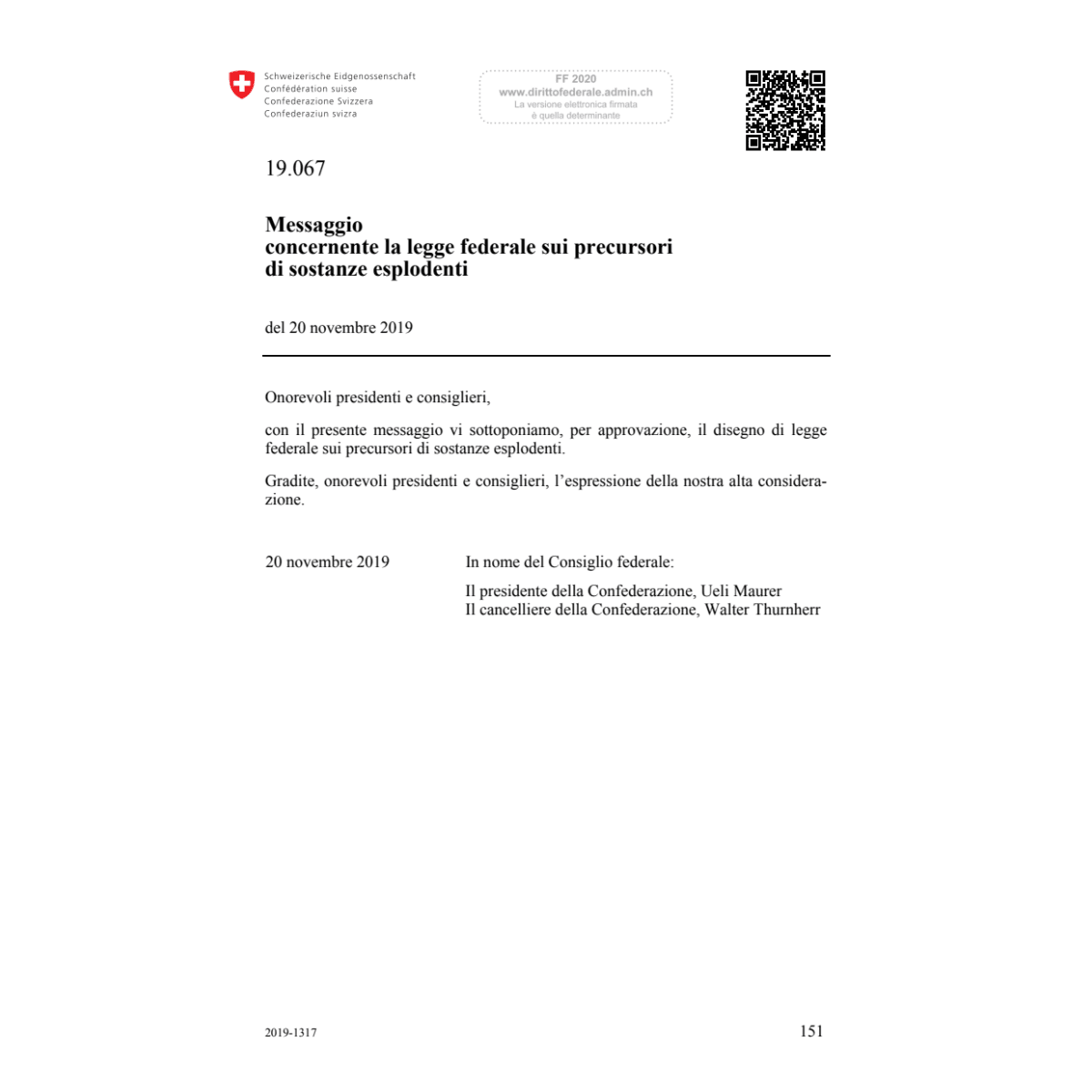 Messaggio concernente la legge federale sui precursori di sostanze esplodenti
