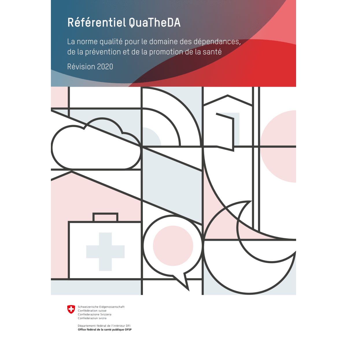 Grâce à la norme de qualité, l'OFSP veut soutenir la professionnalisation et l'efficience des prestations dans les domaines de la promotion de la santé, de la prévention et de la prise en charge des personnes souffrant d’addictions. Cette publication vous renseigne sur le référentiel QuaTheDA, son processus de révision, les certifications et les différentes exigences de qualité.
