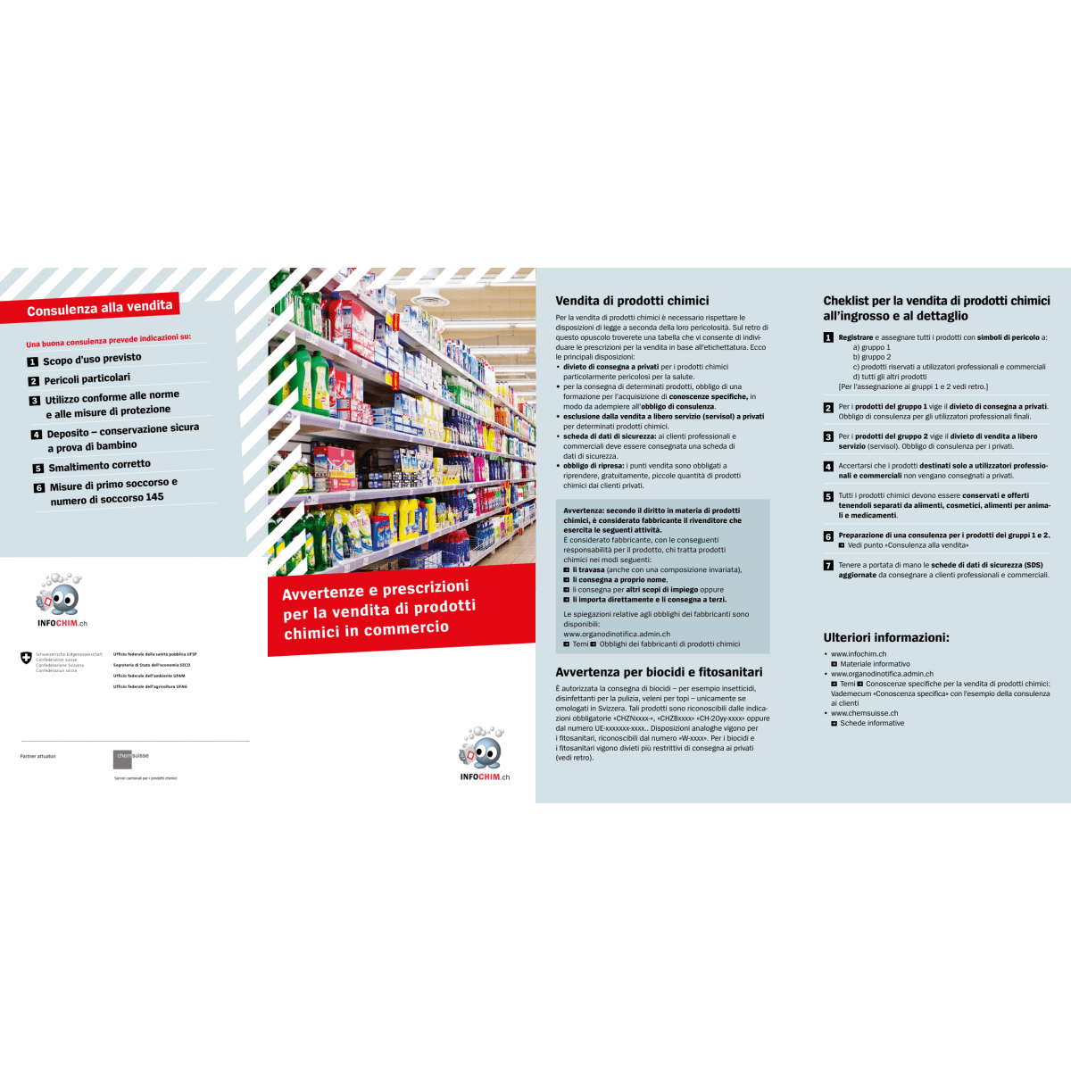 Il flyer contiene informazioni sulla nuova caratterizzazione dei pericoli dei prodotti in commercio e una panoramica dei simboli di pericolo e delle prescrizioni per la vendita.