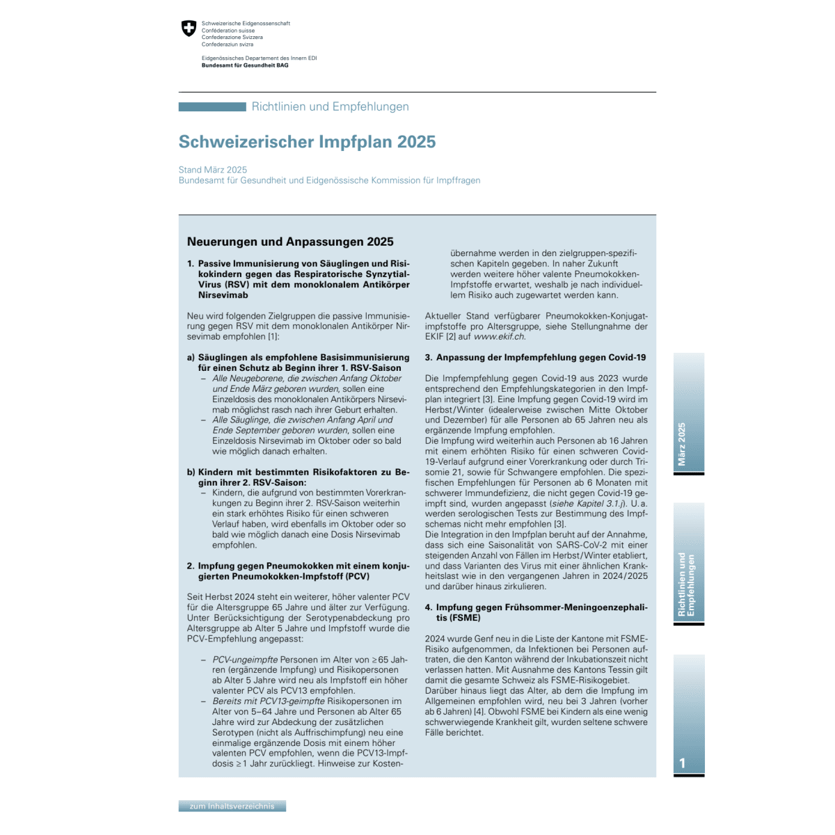 Die Informationen über die in der Schweiz empfohlenen Impfungen sind im Schweizerischen Impfplan enthalten. Eine aktualisierte Version erscheint jeweils zu Jahresbeginn, welche neue Entwicklungen von Impfstoffen, neue Erkenntnisse über deren Wirksamkeit und Sicherheit, Veränderungen der epidemiologischen Lage in der Schweiz sowie Empfehlungen der WHO-Experten berücksichtigt. Die in diesem Plan formulierten Impfempfehlungen zielen auf einen optimalen Impfschutz der Bevölkerung ab.