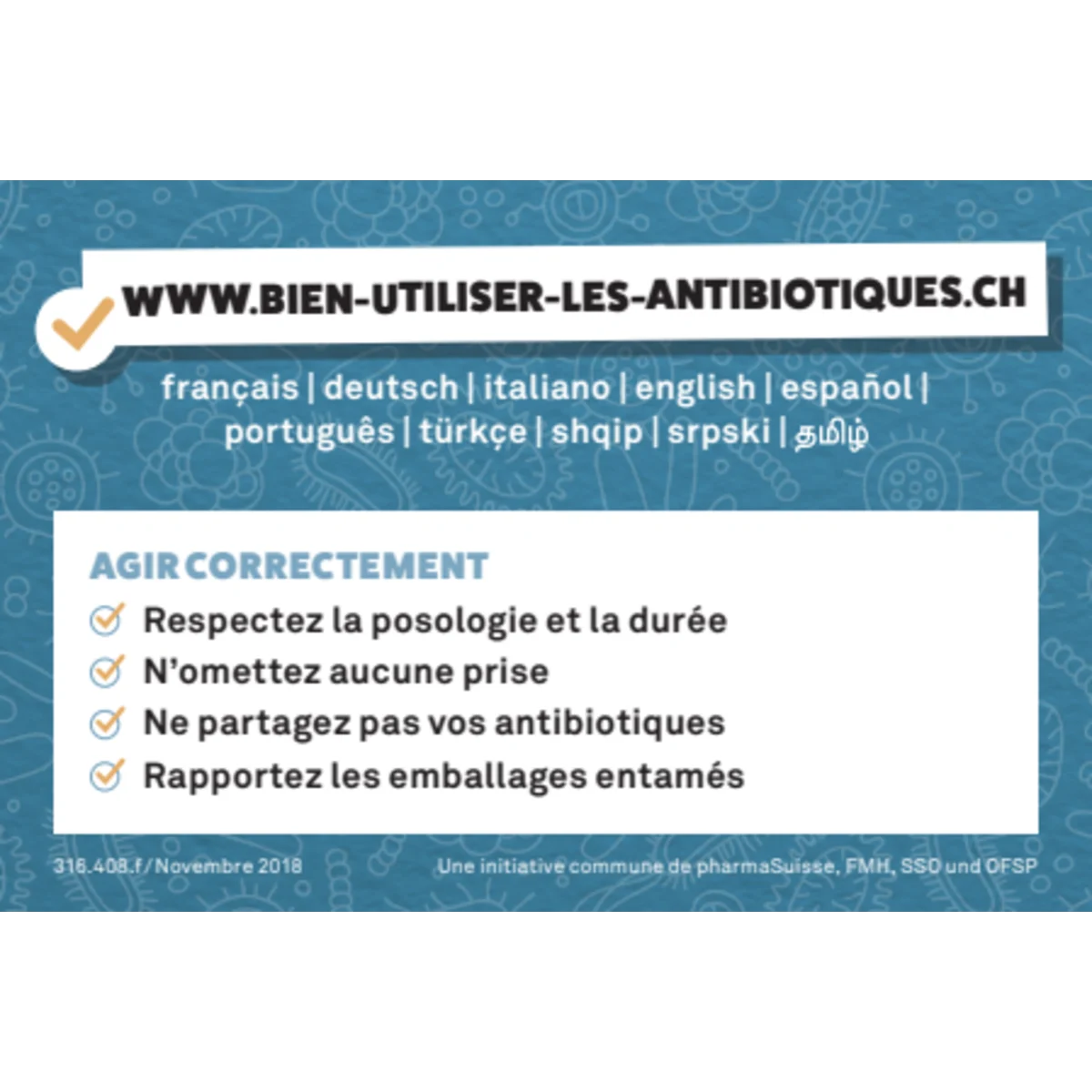 Ce bloc de post-it produit dans le cadre de la campagne de sensibilisation sur la résistances aux antibiotiques comprend des conseils pour utiliser correctement ce type de médicament. Ces quatres recommandations sont inscrites sur chaque post-it: respectez la posologie et la durée, n'omettez aucune prise, ne partagez pas vos antibiotiques et rapportez les emballages entamés.