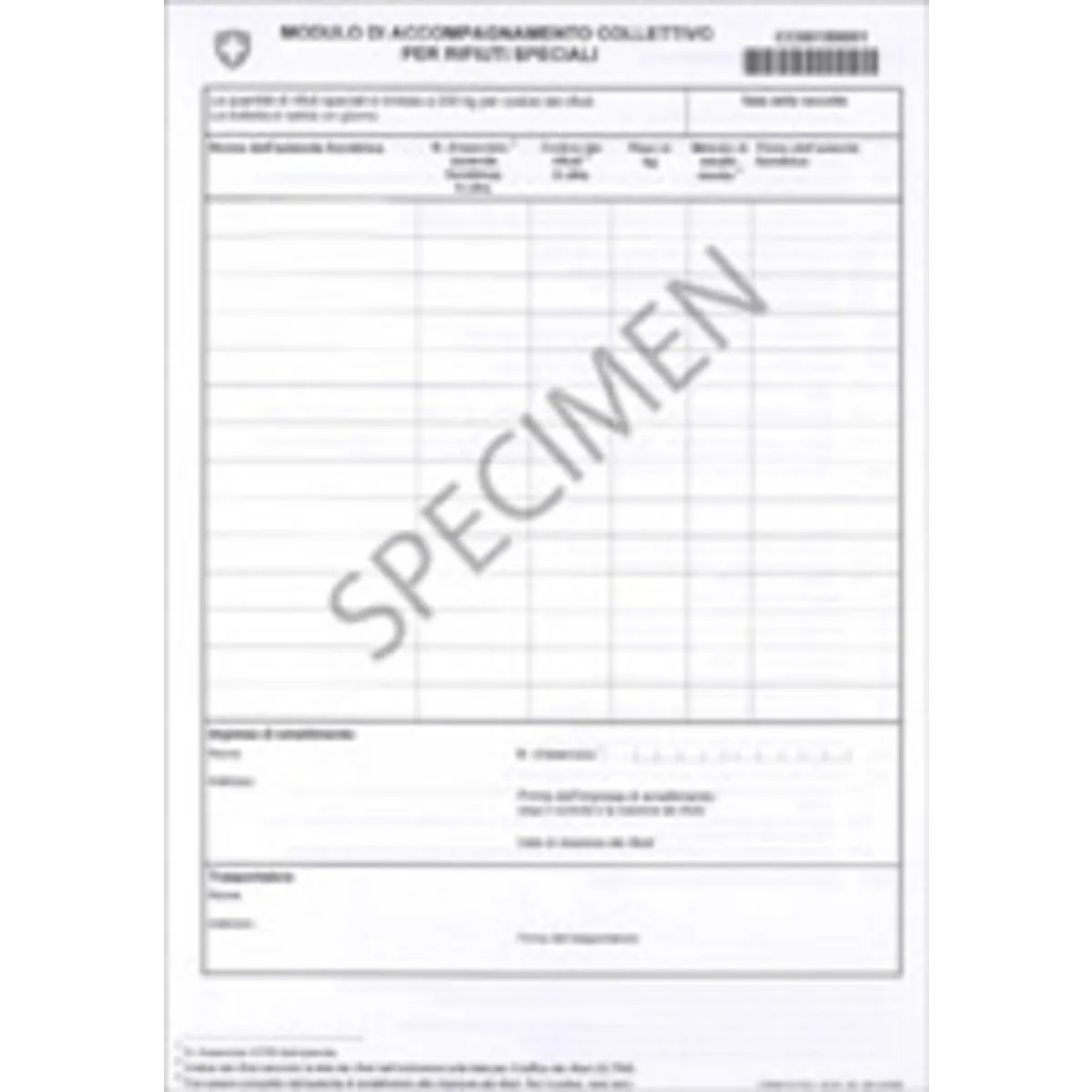 Il modulo di accompagnamento collettivo per rifiuti speciali può essere utilizzato per i rifiuti speciali raccolti lo stesso giorno presso diverse aziende fornitrici in quantità non superiori a 200 kg per codice di rifiuto e per azienda fornitrice. Tuttavia, la raccolta non deve durare più di un giorno e non deve prevedere l'impiego di diversi trasportatori e di diverse zone di trasbordo. Questa forma di modulo si presta, ad es., alla raccolta dei rifiuti speciali sanitari presso gli studi medici.
