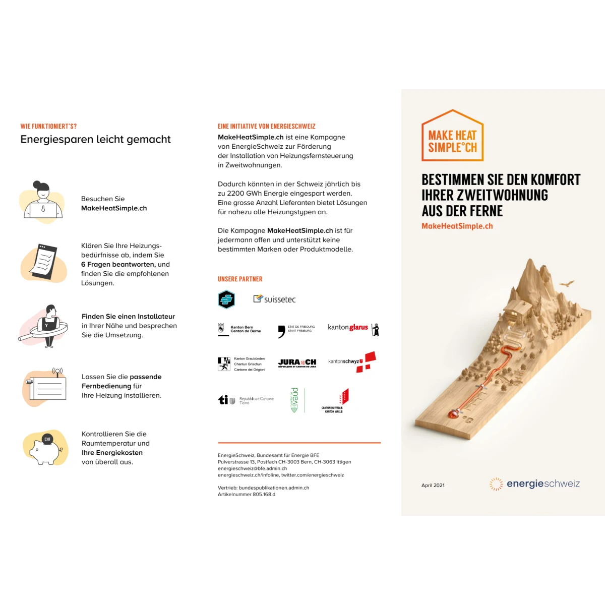 MakeHeatSimple.ch ist eine Kampagne von EnergieSchweiz zur Förderung der Installation von Heizungsfernsteuerung in Zweitwohnungen. Möchten auch Sie die Raumtemperatur ortsunabhängig per Fernbedienung steuern? In diesem Flyer erfahren Sie, wie Sie am besten vorgehen und welche Vorteile Ihnen dieses System bietet.